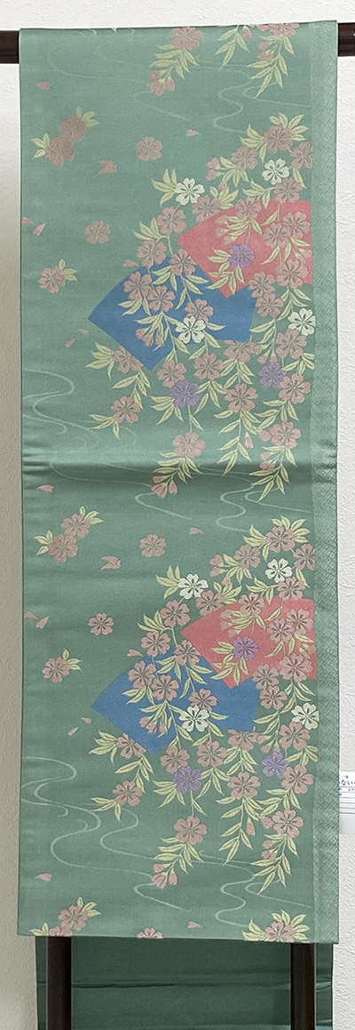 確りとした張りのある手触りのくすんだ濃い青磁色のポリエステル錦の地織りに、流水に枝垂れ桜や扇などの柄を青ネズ色や黄赤色・薄紫色などと少しの金糸と紫色の色箔を加え重ね織りした品。京袋仕立て。