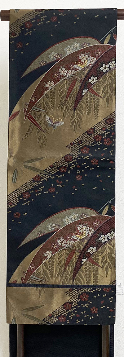 しなやかな手触りのくすんだ金糸を織り込んだ黒のポリエステル錦の地織りに、笹や花蝶などの柄をエンジ色や青ネズ色・地色濃淡などで重ね織りした品。京袋仕立て。