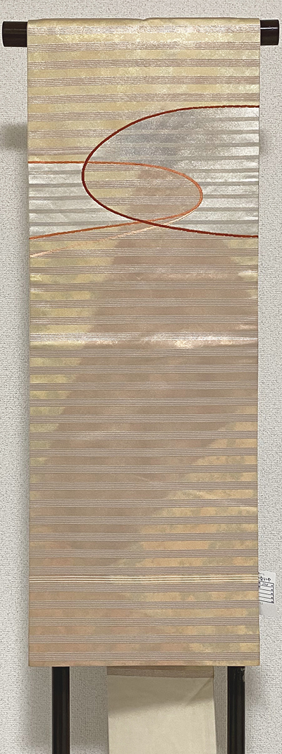 張りのある手触りで確りと打ち込まれた金糸を重ねたベージュ色とピンクベージュ色の暈しの錦地織りに、お太鼓の横線柄を銀糸で織り込み、曲線柄を黄赤濃淡で重ね織りした品。三角部分の近くに生地足しのハギがあります。