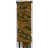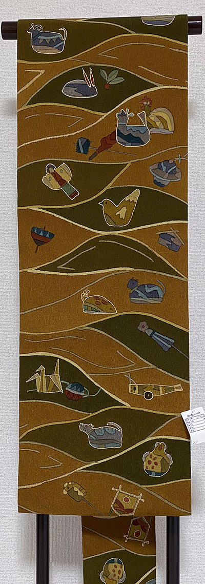 確りとした手触りの鬼縮緬の生地を金茶濃淡に地染めし、民芸玩具の柄をモスグリーンと少しのエンジ色に金彩の縁取りを加え重ね染めした品。趣のある柄です。