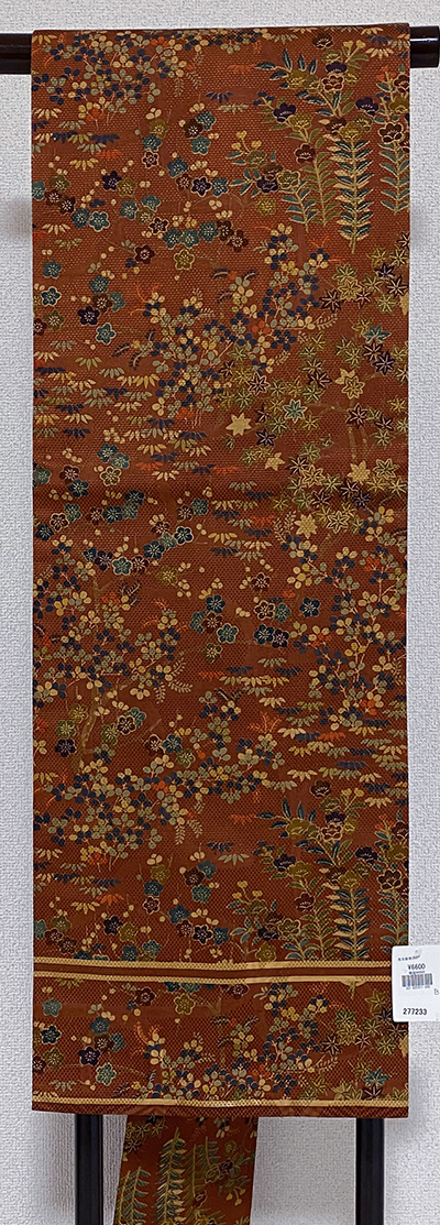 張りのある手触りで確りと打ち込まれた曲線柄を織り込んだくすんだ黄赤の錦の地織りに、小花などの柄を緑色や青色と金茶色などで重ね染めした品。コシのある締めやすそうな生地です。タレ裏に落款があります。