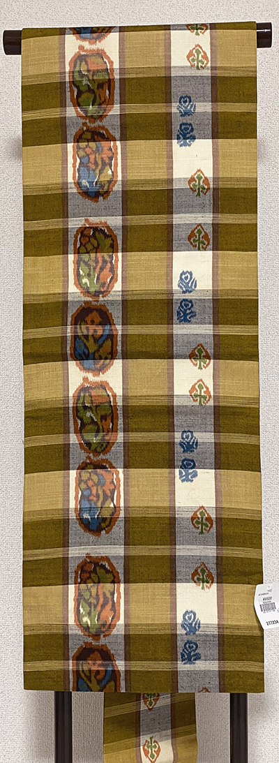 しなやかな良い手触りの横糸にフシ糸を織り込み、金茶色やカーキ色で格子柄を織り込んだ紬の地織りに、花柄を青ネズやエンジ色と青色などで重ね織りした品。