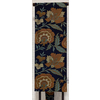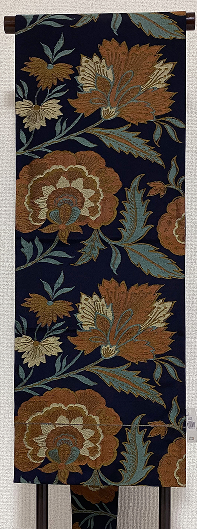 張りのある手触りで確りと打ち込まれた横糸にフシ糸を織り込んだ深い紺色の紬の地織りに、大きな花柄を黄赤や青ネズにベージュ色などで重ね織りした品。