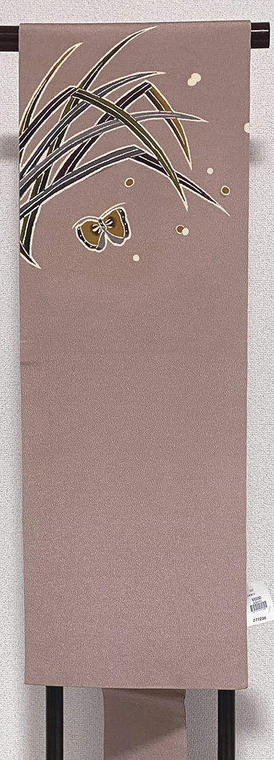 しなやかな手触りの古代縮緬の生地をくすんだ藤ローズ色に地染めし、お太鼓の露芝と蝶の柄を青ネズや紫色に金茶色などで重ね染めした品。