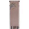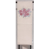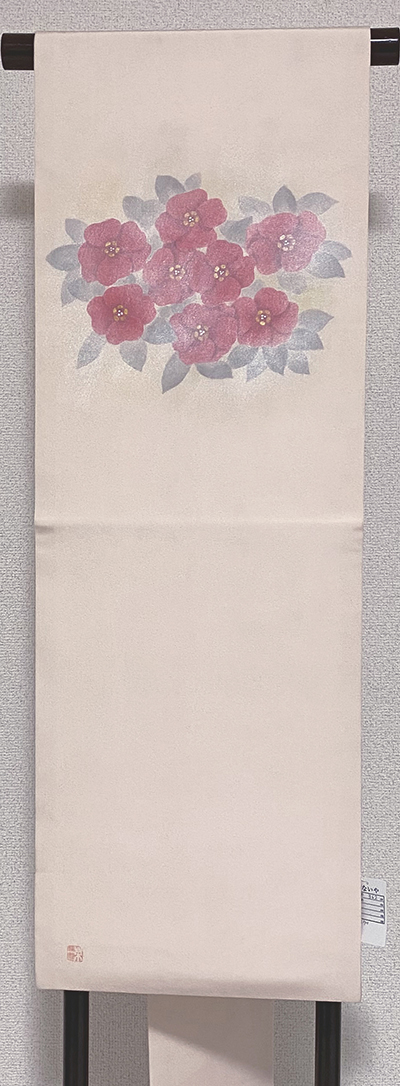 スベリの良い手触りで確りと打ち込まれた上質な塩瀬の生地をくすんだ薄ピンク色に地染めし、お太鼓の花柄を赤や薄ネズ・金茶などで重ね染めし、銀彩暈しを重ねて仕上げた品。タレに作家落款があります。