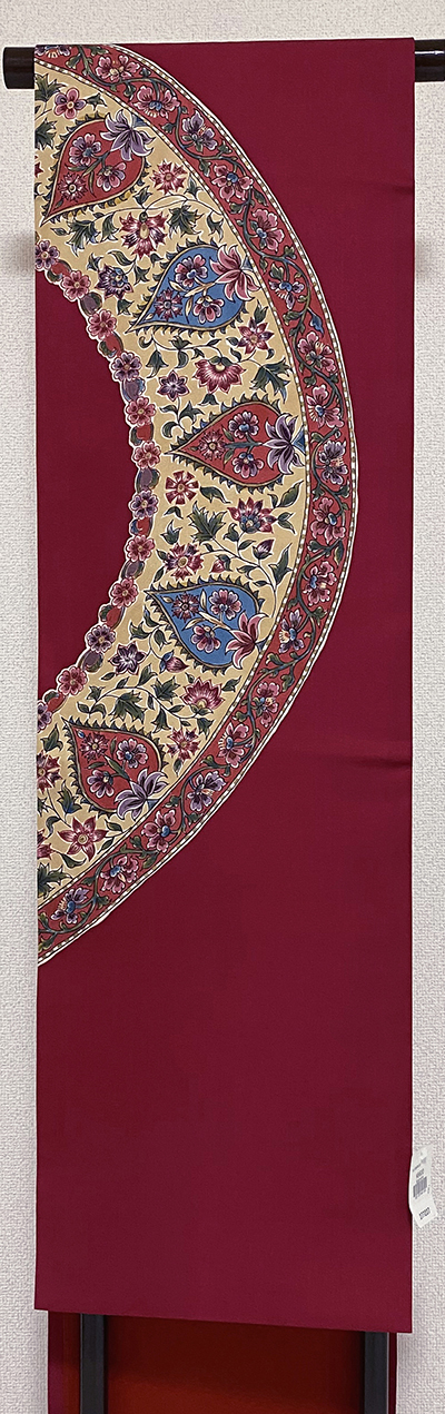 スベリの良い手触りで確りと打ち込まれた上質な塩瀬の生地を深いエンジ色で地染めし、曲線取り更紗の蔓花の柄をベージュ色や青色に緑色などで重ね染めした品。手先まで平仕立て、裏地が付いた額縁仕立て。タレ裏に作家名があります。