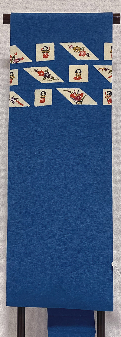 しなやかな手触りで確りと打ち込まれた鬼縮緬の生地を青に近い深い水色に地染めし、お太鼓の四角取り花と人形などの柄をベージュ色に紫色や黄赤色と緑色などで重ね染めした品。