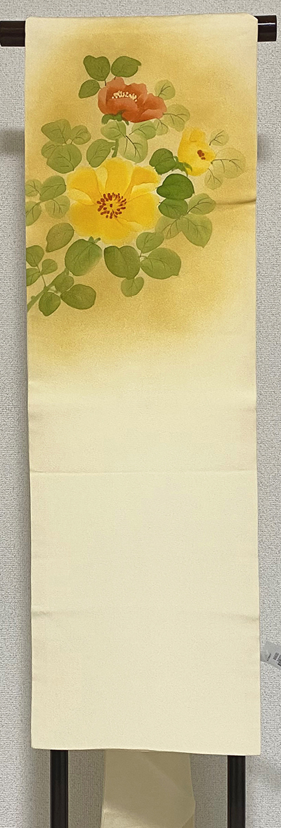 張りのある手触りで確りと打ち込まれた上質な塩瀬の生地を淡いベージュ色に地染めし、お太鼓の枝花の柄を金茶色や赤色と薄緑色などで重ね染めし、金彩暈しを重ねて仕上げた品。