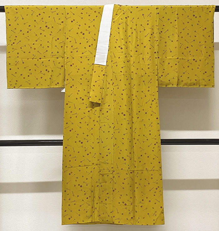 しなやかな手触りの精華縮緬の生地を辛子色に地染めし、小花やかんざしなどの柄をエンジ色や少しのウグイス色などで重ね染めした品。正絹通し裏が付いた袖無双の袷仕立て、正絹白半衿が付いています。手縫い仕立て。