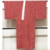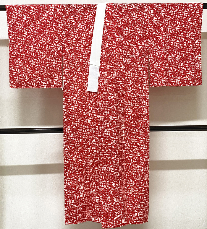 しなやかな手触りの精華縮緬の生地を鮮やかな赤色に地染めし、小花の柄を白で重ね染めした品。背伏せは別生地が付いた袖無双の単衣仕立て、正絹白半衿が付いています。手縫い仕立て。