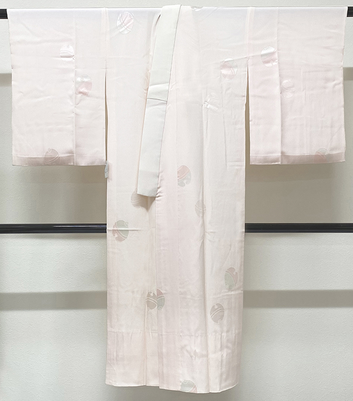 しなやかな手触りの小さなシボと鈴の地柄を織り込んだ上質な紋縮緬の生地を淡いピンク色に地染めし、鈴の柄を薄緑色やピンク色の地紋起こしで重ね染めした品。正絹通し裏が付いた袖無双の袷仕立て、正絹白半衿が付いています。手縫い仕立て。