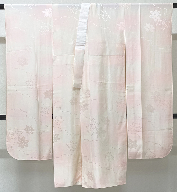 しなやかな手触りの雲と楓の地柄を織り込んだ紋綸子の生地を朱鷺色暈しで染めた品。正絹通し裏が付いた袖無双の袷仕立て。手縫い仕立て。