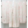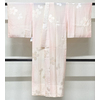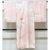 しなやかな手触りの花の地柄を織り込んだ紋綸子の生地を淡いピンク色濃淡に地染めし、花柄を少し濃いめ地色で重ね染めした品。腰から下の後幅一杯に正絹居敷当てが付いた袖無双の単衣仕立て。手縫い仕立て。