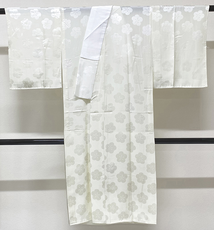 しなやかな手触りの花の地柄を織り込んだ紋綸子の生地を淡い薄黄緑色に地染めし、白の空絞りで重ね染めした品。背伏せは共生地返しで袖無双の単衣仕立て、ポリエステル白半衿が付いています。手縫い仕立て。衿は広衿仕立てで、裾の返しが50センチ程ある仕立てです。