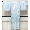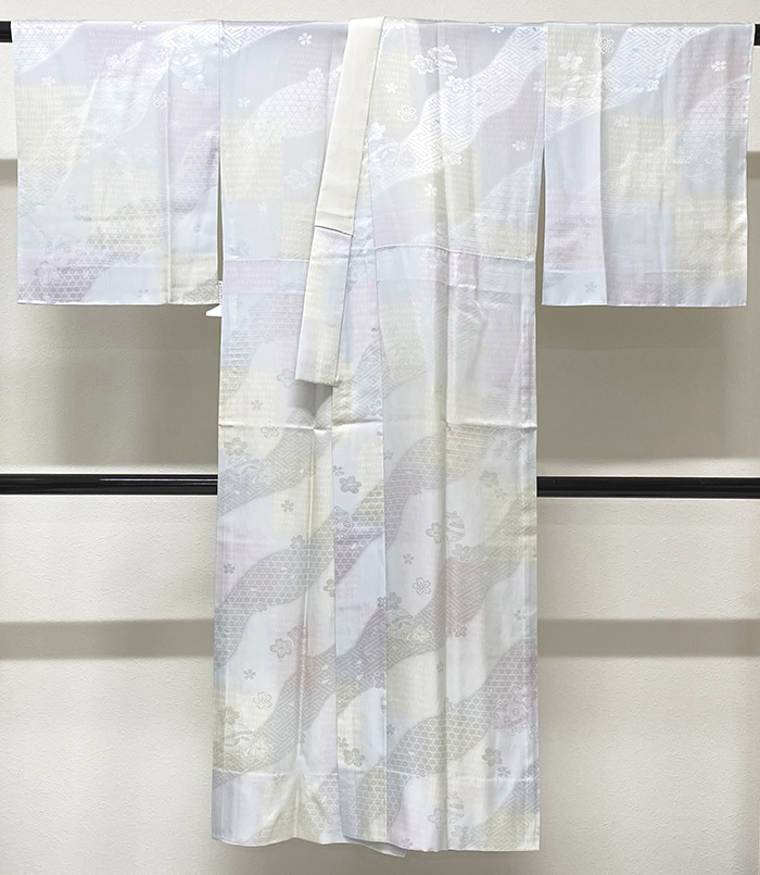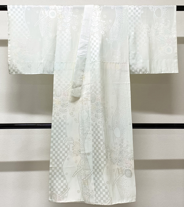 しなやかな良い手触りの市松に小花の地柄を織り込んだポリエステル紋綸子の生地を水色や青磁色・薄藤色などの暈しで染めた品。背伏せは共生地返しで袖無双の単衣仕立て、正絹白半衿が付いています。ミシン併用ハイテク仕立て。