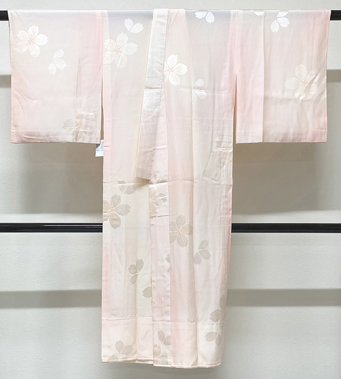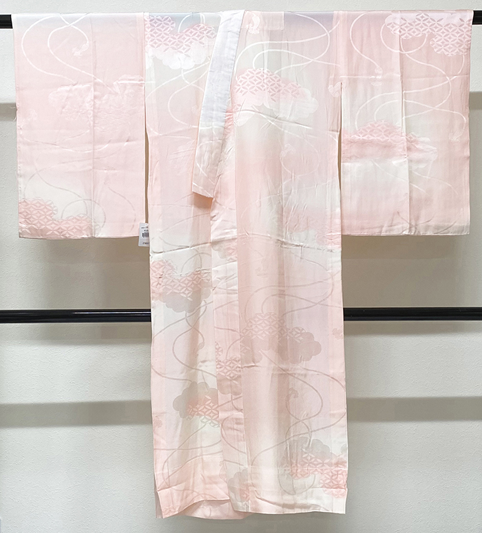 しなやかな手触りの雲と紐などの地柄を織り込んだ紋綸子の生地を淡いピンク色濃淡暈しに染めた品。腰から下の背縫い沿いに共生地の居敷当てが付いた袖無双の単衣仕立て。手縫い仕立て。