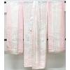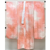 しなやかな良い手触りの扇や花などの地柄を織り込んだポリエステル紋綸子の生地を白と淡いピンク色濃淡暈しに染めた品。背伏せは共生地返しで、袖無双の単衣仕立て。手縫い仕立て。