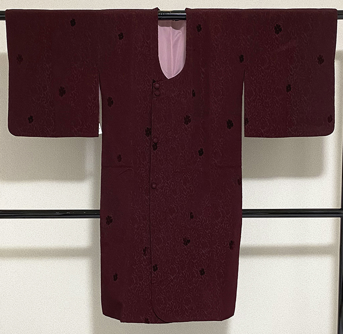 張りのある手触りで確りと打ち込まれ蔓花の柄を小豆色濃淡の輪奈ビロードで織り上げた品。一部の花柄はビロード仕上げになっています。裏地は正絹藤ピンク色が付いています。千代田衿仕立て。