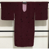 しなやかな手触りの無地意匠の生地を深い紫みの小豆色に青ネズや黄赤色の細かな吹雪を重ねて地染めし、絵羽取り流水取り梅や橋などの柄を地色濃淡と金彩で重ね染めした品。裏地は正絹が付き、里山風景の柄を白にウグイス色などで染めた品です。