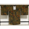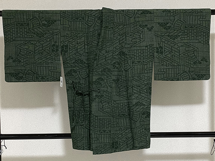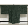 しなやかな手触りのフシ糸と真綿を加えた紬織り生地で、深い緑色の地織りに、白の亀甲で花柄を織った品。裏地は正絹が付き、金茶色に少しの紅色を斜めに染めた品です。共生地の飾り紐が付いています。衿裏にはくるみホックが付いています。 衿裏に足し布があります。