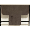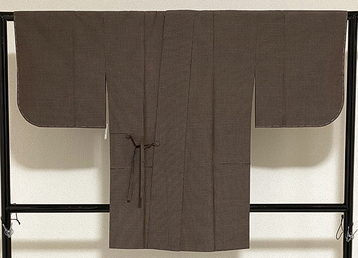 しなやかな手触りの小さな格子柄を織り込んだ紬織り生地で、深いこげ茶色の地織りに、格子柄を金茶色で織った品。裏地は正絹が付き、白地に紅色の細縞を染めた品です。共生地の飾り紐が付いています。