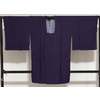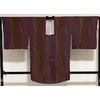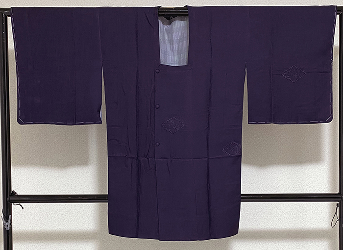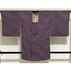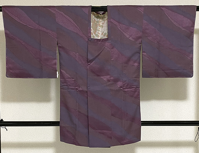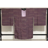 しなやかな手触りの良い細かな縦縞格子の地柄を織り込んだ生地で、くすんだ紫色の地色に、絵羽取り花柄を背中に刺繍した品。裏地は正絹が付き、青ネズ色濃淡で縞柄を染めた品です。