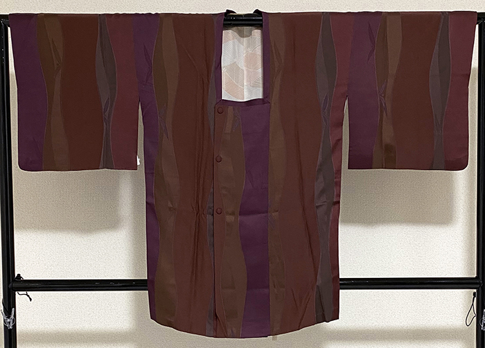 しなやかな手触りのヨロケ縞の地柄と少しの花柄を織り込んだ艶のある紋意匠生地で、赤紫色や金茶色にくすんだ緑色などの縦暈しで染めた品。裏地は正絹が付き、松葉の柄を白ネズ色や黄赤色やベージュ色などで染めた品です。
