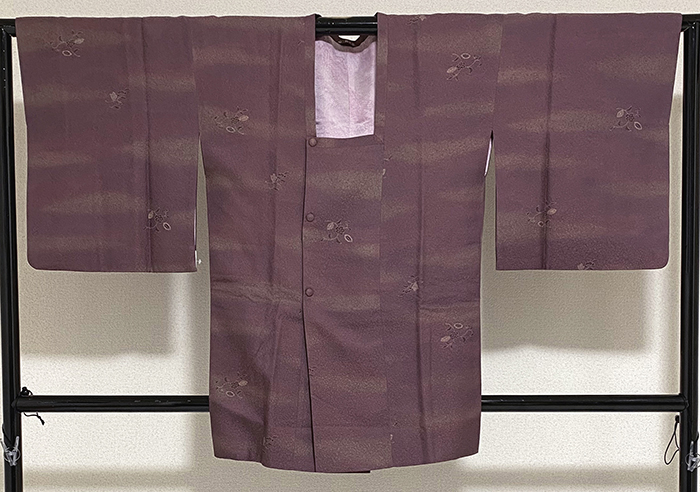 しなやかな小さな霜降りを織り込んだ紋意匠生地で、くすんだ赤紫色濃淡の横段暈しの地色に、花柄を地色濃淡で染めた品。裏地は正絹が付き、小さな波柄を赤紫色濃淡で染めた品です。