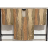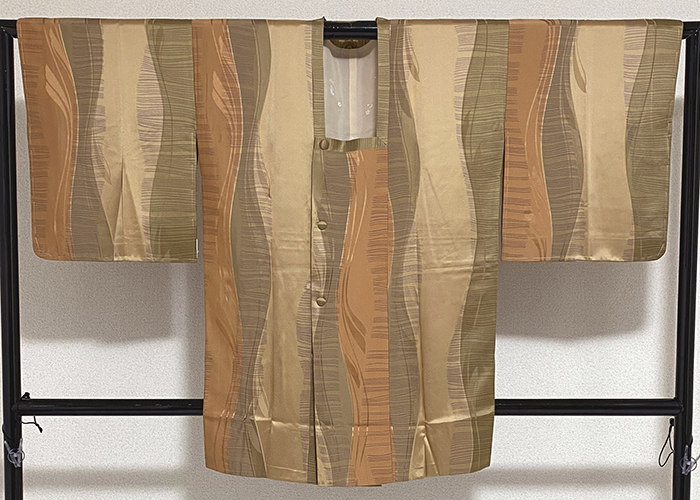 しなやかな光沢のある縦に流れるヨロケの柄と少しの笹の葉柄を織り込んだ緞子織り生地で、金茶色と黄赤色をヨロケに染め、少しの薄紫色を横段に染めた品。裏地は正絹が付き、ベージュ色に桜と子供の柄を少しの色を加えて染めた品です。