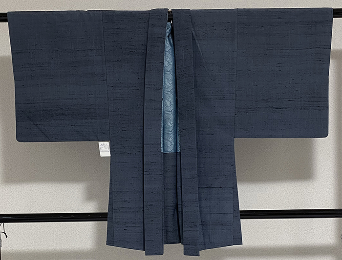 張りのある手触りで黒のフシ糸を織り込んだ鉄紺のシルクウールで織り上げた品。裏地は木綿赤みの紺色の通し裏が付いています。手縫いの袷仕立て。