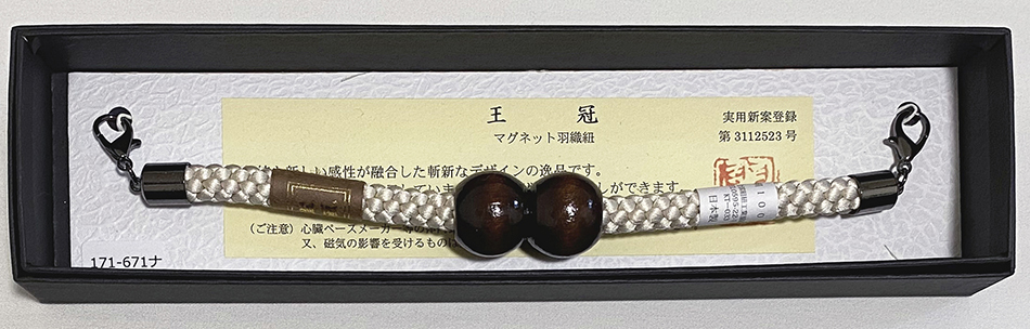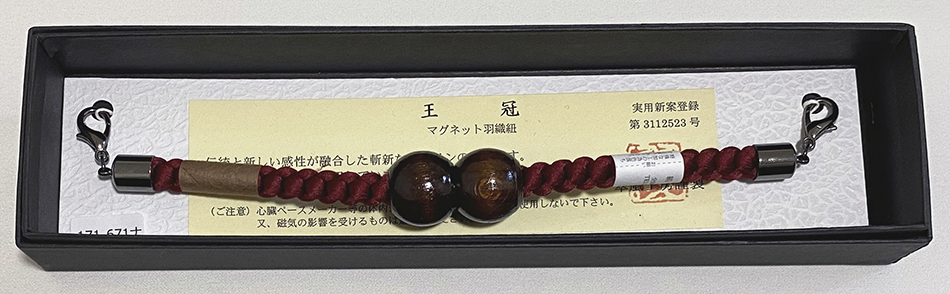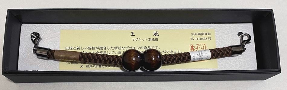 確りと組み上げたこげ茶色の八つ組み紐に、マグネットが付いたこげ茶の木製ビーズ2個を合わせて取り付け左右に離すと着脱できる、翠嵐工房謹製日本製の品。両端にカニ環が付いています。箱入り。