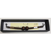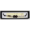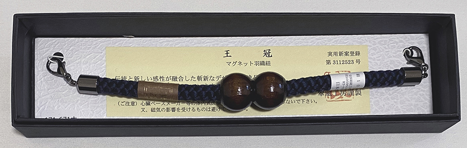 確りと組み上げた鉄紺色の八つ組み紐に、マグネットが付いたこげ茶の木製ビーズ2個を合わせて取り付け左右に離すと着脱できる、翠嵐工房謹製日本製の品。両端にカニ環が付いています。箱入り。