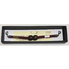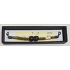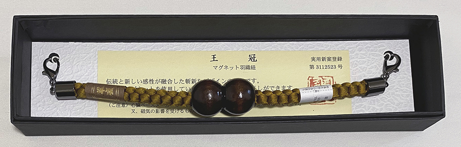 確りと組み上げた金茶色の四つ組み紐に、マグネットが付いたこげ茶の木製ビーズ2個を合わせて取り付け左右に離すと着脱できる、翠嵐工房謹製日本製の品。両端にカニ環が付いています。箱入り。