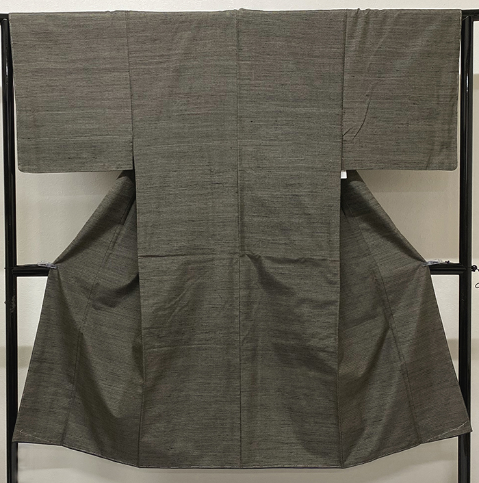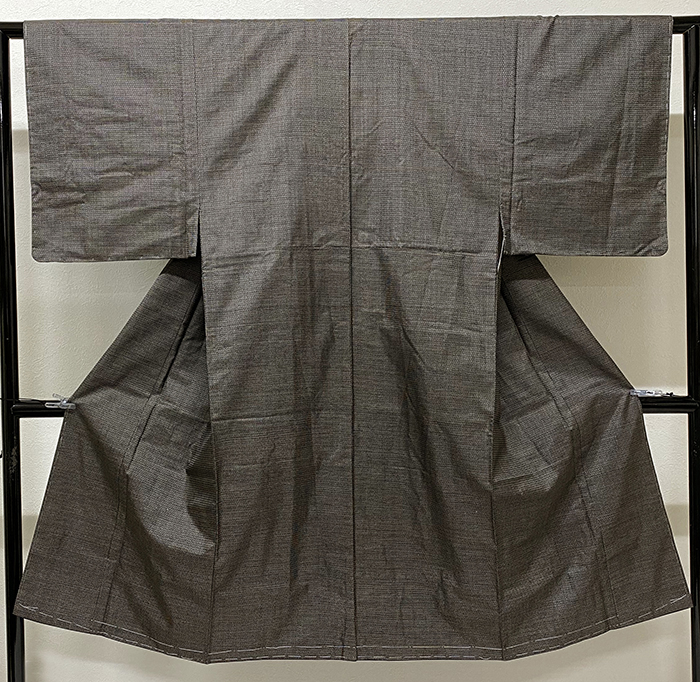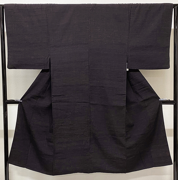 しなやかでシャリ感のある手触りの紬で、金茶色のフシ糸を少し織り込んだ紫みのこげ茶色で織り上げた品。裏地は正絹黒の通し裏が付いています。手縫い仕立て。