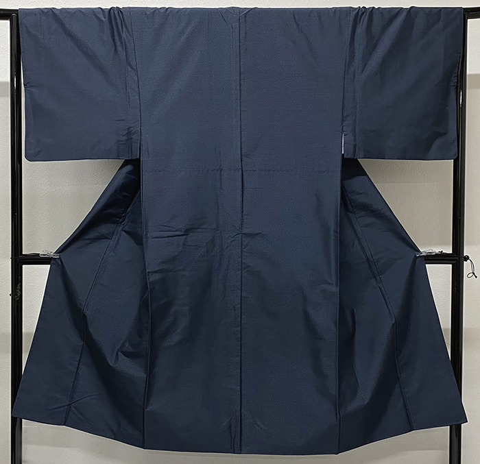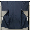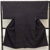 張りのある手触りの大島紬で、黒の地織りで、変わり亀甲の柄を青ネズの縦横絣で重ね織りした品。裏地は木綿黒の通し裏が付いています。