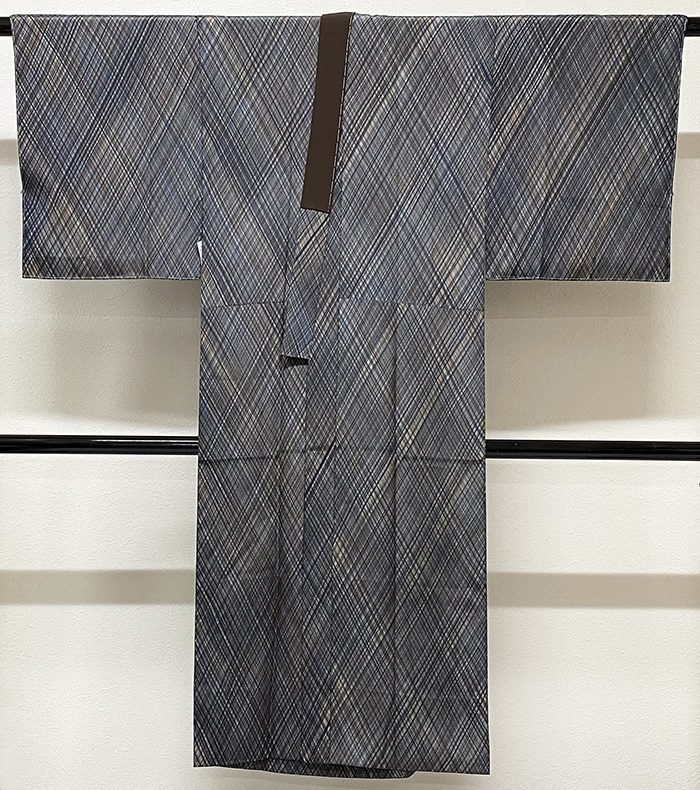 しなやかな手触りのパレス織りの生地で、紺色と薄茶色濃淡で斜め格子柄を染めた品。正絹白の通し裏が付いた袖無双の袷仕立て、正絹こげ茶色の半衿が付いています。手縫い仕立て。