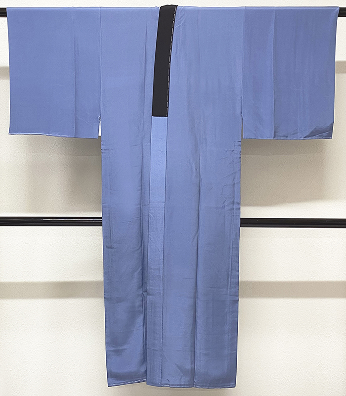 長襦袢丈は134センチで、スベリの良い手触りの精華縮緬の生地を青ネズ濃淡に地染めし、背中の大名行列の柄を深緑色濃淡や茶色などに金彩を加え重ね染めした品。正絹薄グレー色の通し裏が付いた袖無双の袷仕立て、正絹藤ネズに黒の格子柄の半衿が付いています。