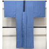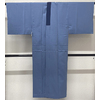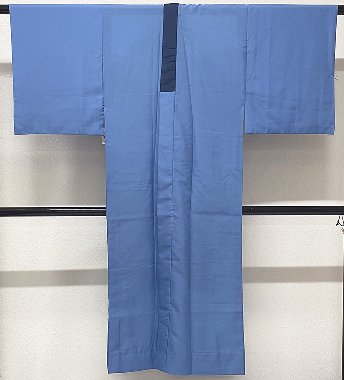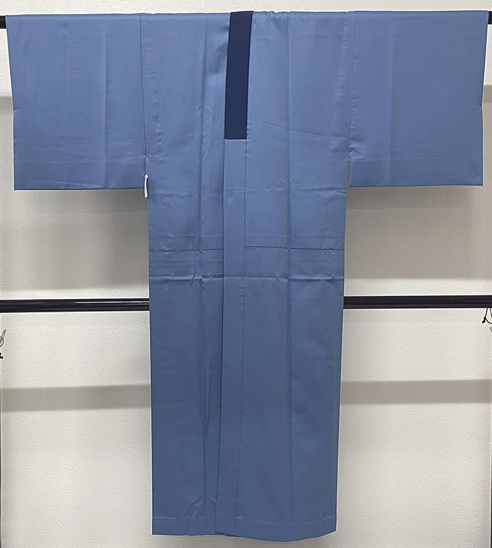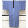 薄手でやわらかな手触りのポリエステルの生地を明るい少しくすんだ水色に地染めし、背中の富士山や大名行列の柄をこげ茶色や少しの金彩を加え重ね染めした品。袖無双の単衣仕立て、ポリエステル黒の半衿が付いています。ミシン縫い仕立て。