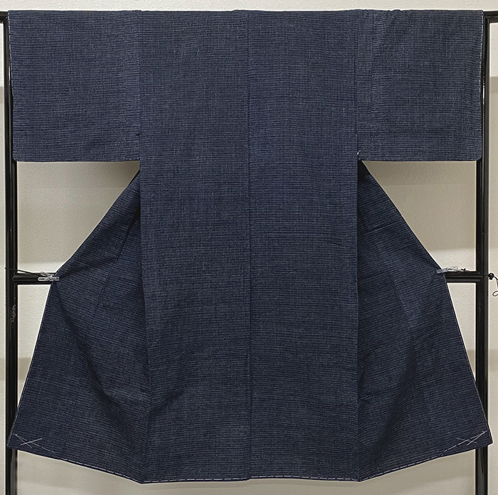 しなやかな手触りの上質な木綿織りで、深い紺色の地織りで、絣柄を青ネズで重ね織りした品。裏地は木綿紺色の通し裏が付いています。手縫い仕立て。