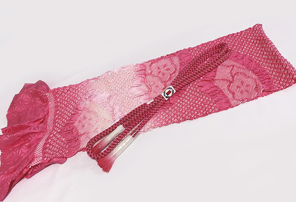 帯揚げは、しなやかな手触りの麻の葉柄を織り込んだ綸子生地で、深いピンク色に淡いピンク色で柄を絞りで仕上げた上質な加工の品。