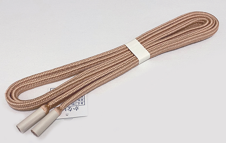 くすんだ珊瑚色の無地に組み上げた、冠組みの品。道明謹製。箱入り。
