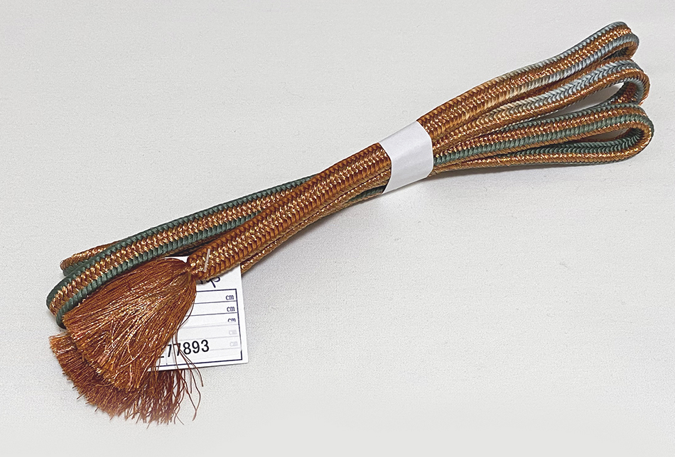 確りと組み上げられた緑色と朱金色に金糸を組み込んだ、冠組みの品。