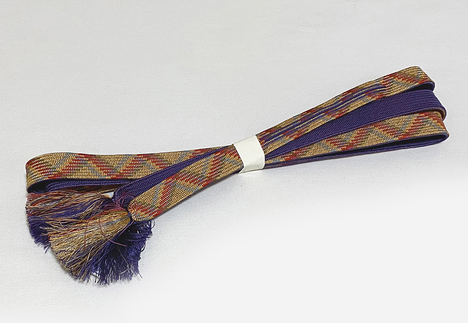 裏糸に紫色を重ねた確りと薄手に組み上げた高麗組みで、金糸と黄赤色に薄緑色で織った品。