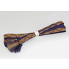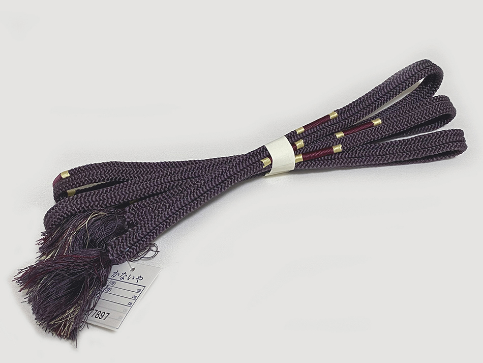 くすんだ紫色の細八つ組みを3本繋げた平組みで、片端にエンジ色とベージュ色を加え組まれた品。