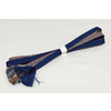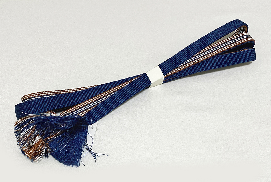 確りとした手触りの内記組みで、緑みの紺色に組み上げた品。裏面は、黄赤色と紺色に白糸で縞柄を組み込んだ品。