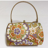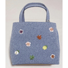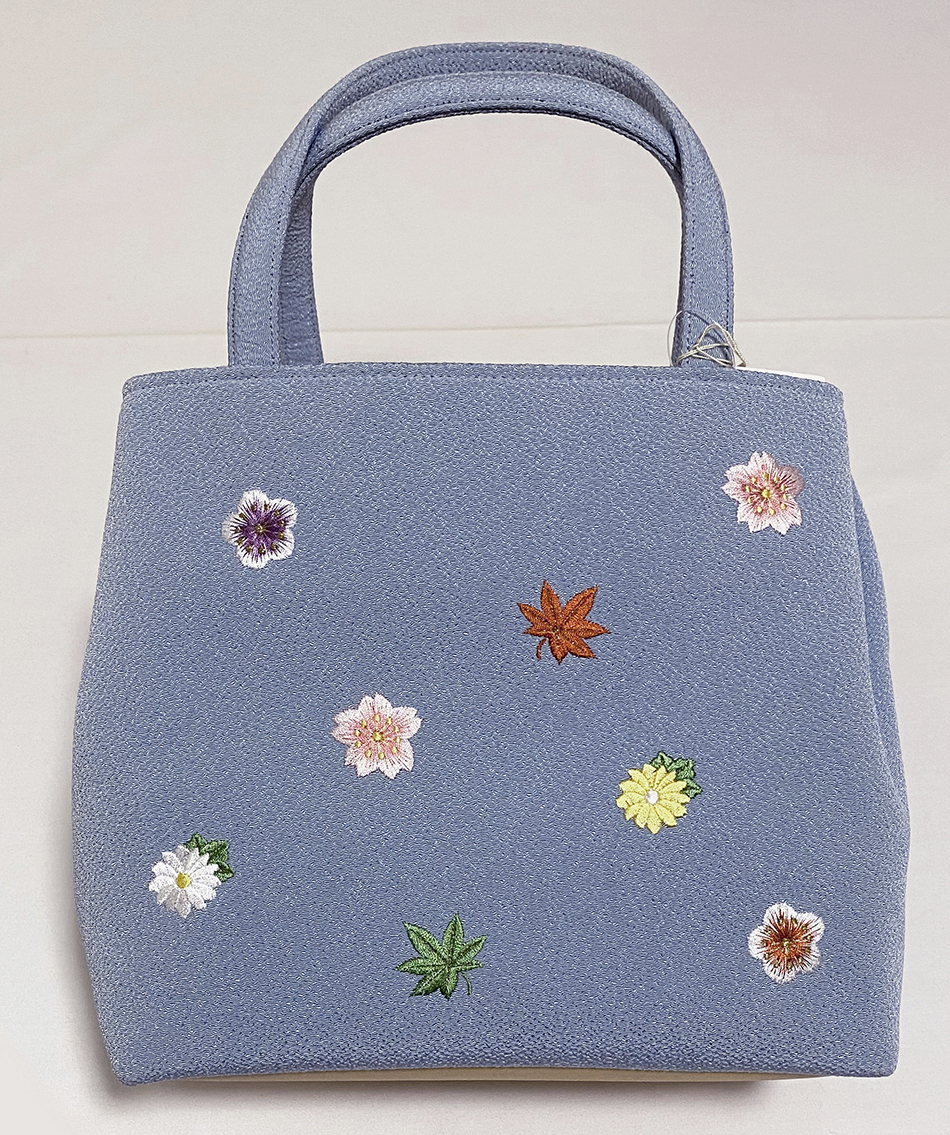 濃い水色のポリエステル縮緬の生地に、花柄をピンク色やベージュ色に紫色や緑色などで刺繍を施し、バッグの底にはベージュ色の人工皮が付いた、二本手仕上げの品。京都井澤屋謹製、タグが付いています。箱入り。 バッグの中は、大きな物入れが2ヶ所とファスナー付き物入れ、ポケットが付き、中の留め金が2ヶ所付いた丁寧な品です。