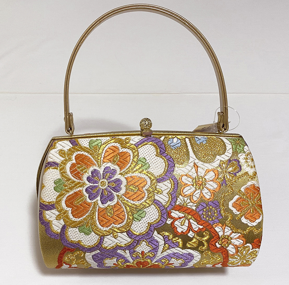 金の下地に正絹の花柄の帯地を両面に取り付けた華やかな仕上がりで、花柄には金糸金箔と黄赤色や珊瑚色に薄紫色と緑色などで織り上げた帯地を使用した、一本手仕上げの品。