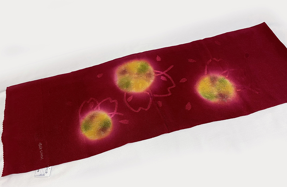 しなやかな手触りの縦縞をフクレ織りで重ね、花の地柄を織り込んだ紋綸子の生地を藤ローズ色濃淡に地染めし、花びらの柄を黄赤色や紫色などで重ね染めした品。