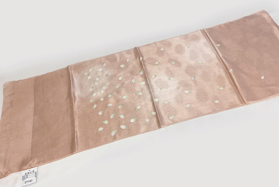 しなやかな手触りで細かな真砂で繭の地柄を織り込んだ紋綸子の生地を淡い珊瑚色濃淡暈しに地染めし、花びらの柄を白の胡粉と薄緑色で重ね染めした品。 ※こちらの商品のみで、「ネコポス配送」が可能な商品です。ネコポスでの配送をご希望される場合はご注文時にメッセージ欄にてお知らせくださいませ。