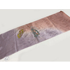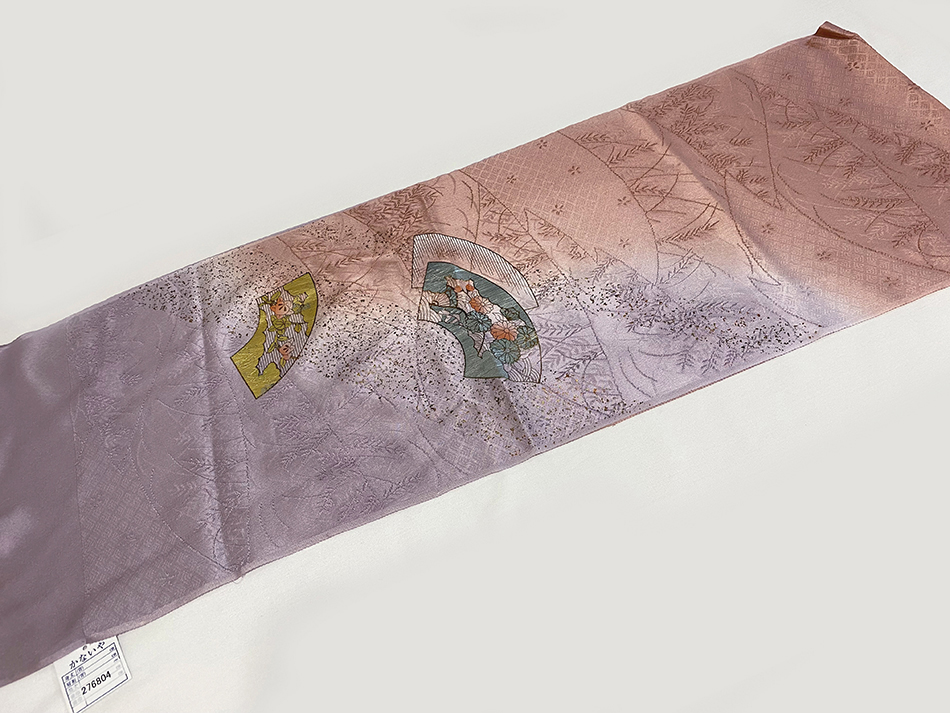 しなやかな手触りの小さな草花や紋柄などの地柄を織り込んだ紋綸子の生地を藤ネズ暈しとくすんだ海老茶暈しの染め分けに地染めし、扇取り花の柄を金銀彩などで重ね染めした品。